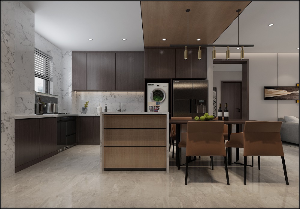 开放式厨房,餐厨一体,对于一些不经常做饭的家庭,可以考虑家里装成开放式厨房,这样可以把餐厅纳入其中,实现餐厨一体。