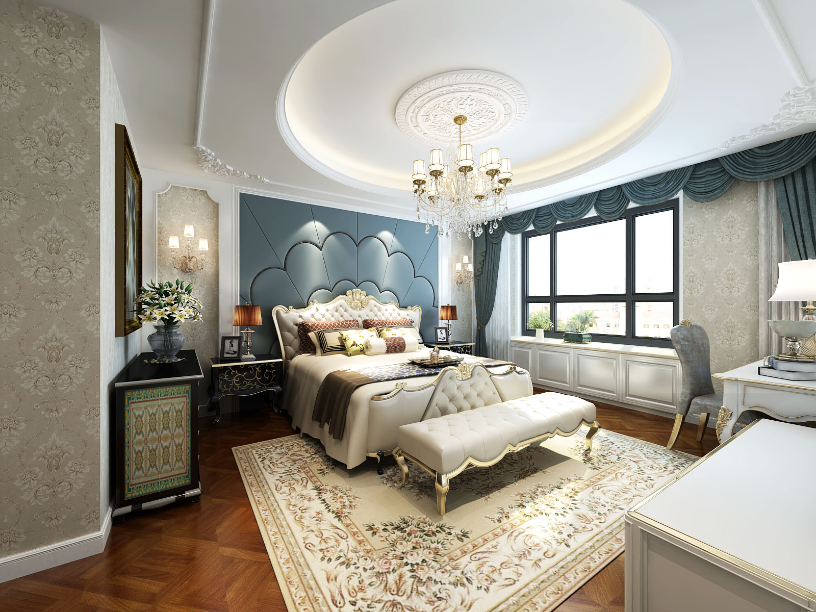 深色地板+浅蓝色墙面,选择浅蓝色或淡色系墙面色更适宜一些,视觉感很和谐,空间也比较开阔。